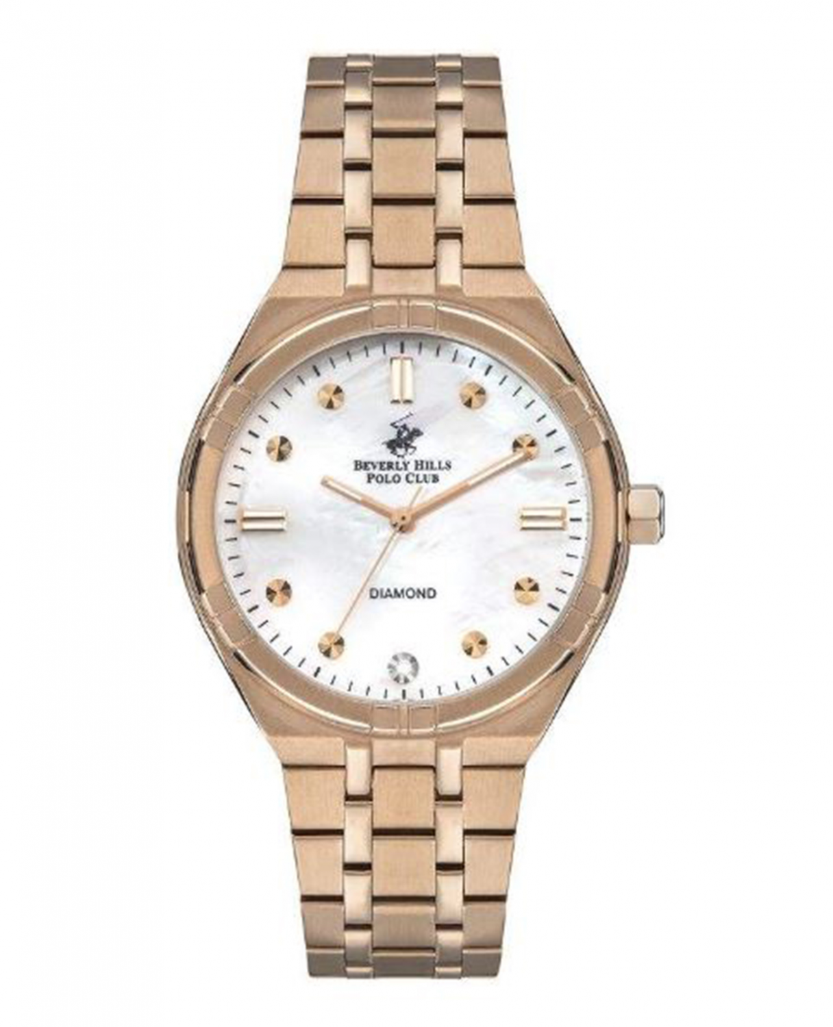Женские кварцевые часы с бриллиантом на перламутровом циферблате, кварцевый механизм с высокой точностью. Класс водозащиты: 30 метров, позволит защитить корпус от случайных брызг или капель дождя. Корпус часов изготовлен из стали с IP покрытием золотого цвета.