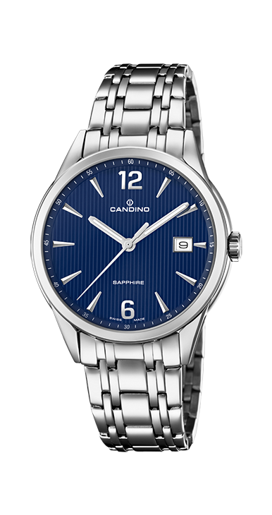 Синий циферблат защищен сапфировым стеклом, устойчивым к царапинам.