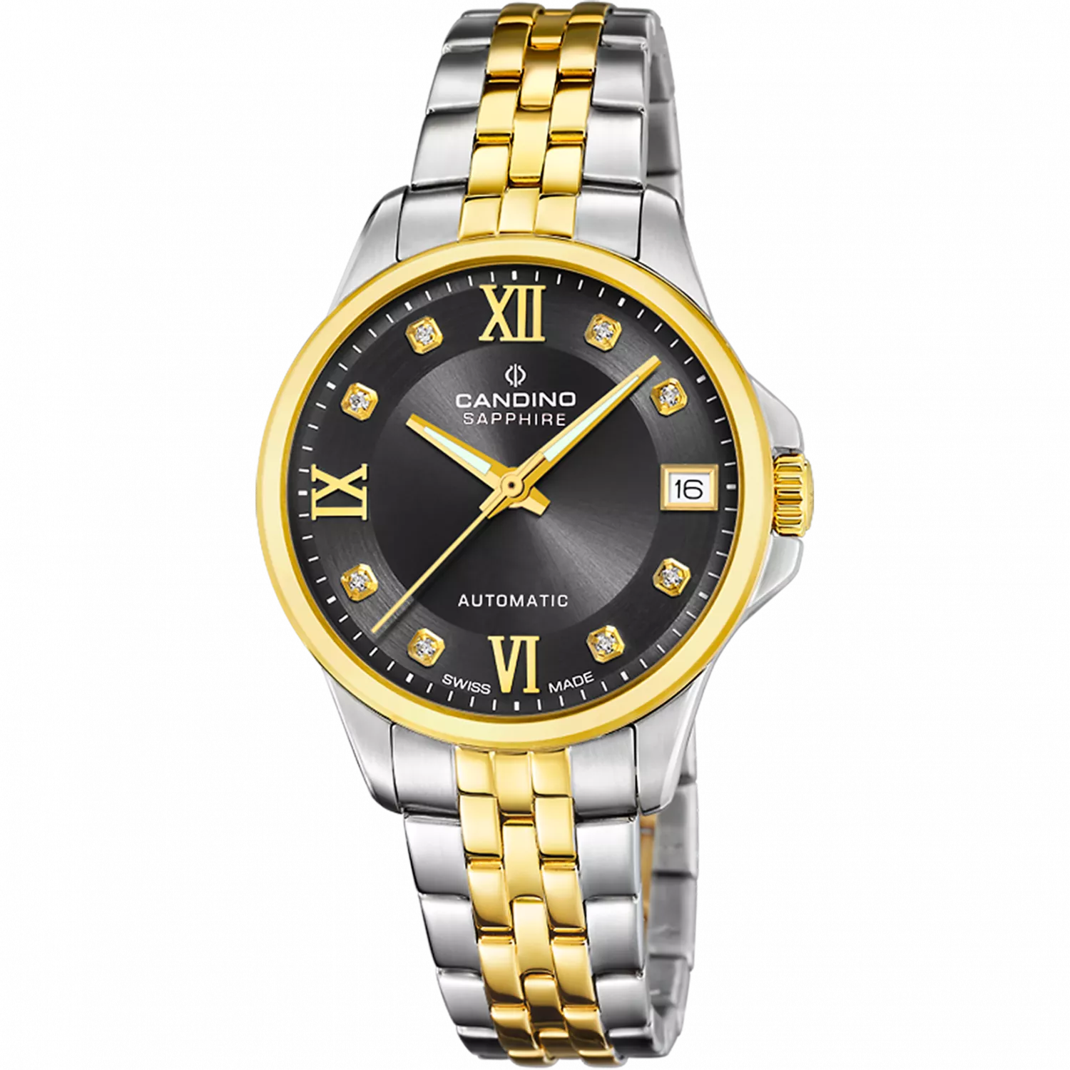 Женские механические наручные часы с автоподзаводом Candino Automatic Ladies. Корпус и браслет часов изготовлены из нержавеющей стали. Сапфировое стекло повышенной прозрачности, устойчивое к мелким механическим повреждениям. Стальной браслет с частичным PVD-покрытием на раскладной застёжке. Стрелки с люминесцентным покрытием. Циферблат инкрустирован кристаллами. Класс водозащиты: 50 метров, позволит защитить корпус от случайных брызг или капель дождя. Окошко даты находится в положении 3 часа.