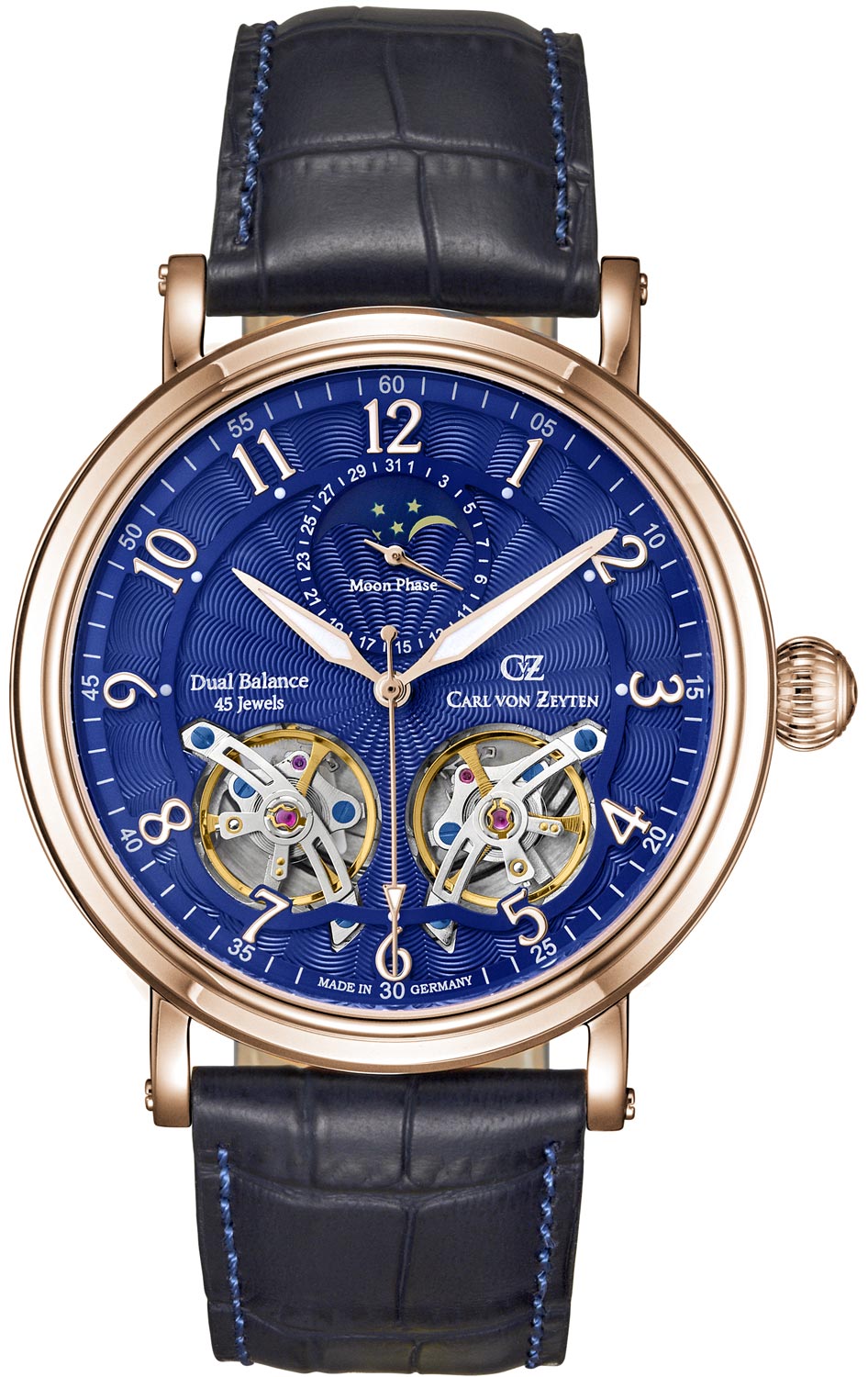 Изящные мужские часы с двумя ''открытыми сердцами'' для демонстрации работы колеса баланса. Темно-синий циферблат дополняют индикатор фаз луны и календарь. Круглый корпус выполнен из стали и покрыт слоем розового золота. Прозрачная задняя крышка защищена минеральным стеклом. Наручные мужские часы Murg. с двумя открытыми балансами на 6 часах. В механизме 45 камней. Синий многоуровневый циферблат с гильоше. Метки в виде арабских цифр. День недели и фаза Луны вынесены на отдельный циферблат. Прозрачная задняя крышка. Сапфировое стекло защитит от царапин. Кожаный ремешок с классической застежкой.