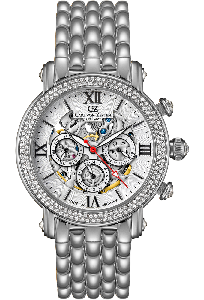 Автоматические женские часы с указателями дня недели, даты и 24-х часовым указателем времени. Корпус из нержавеющей стали 316L. Белый циферблат с гильоше и римскими цифрами. Корпус украшен стразами. Стальной браслет с раскладывающейся застежкой.
