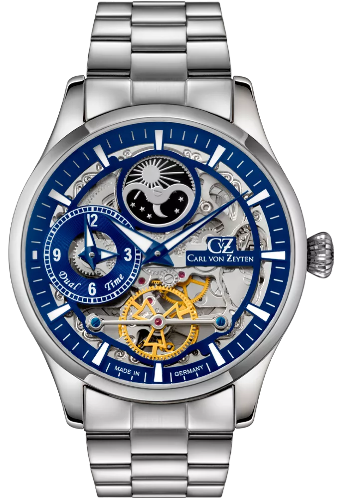 Автоматический скелетон. Функции: часы, минуты, индикатор дня и ночи, 2-й часовой пояс. Корпус из нержавеющей стали 316L.Сапфировое стекло. Синий циферблат. Вороненые винты. Стальной браслет с раскладывающейся застежкой.