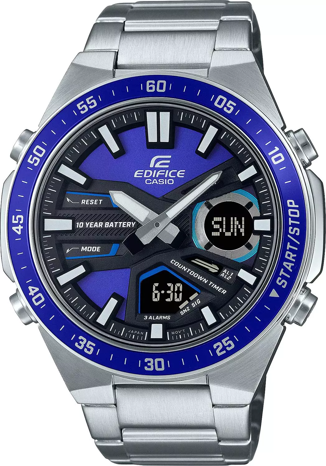 Мужские часы. Необритовое светонакопительное покрытие обеспечивает длительное послесвечение в темноте даже после кратковременного нахождения на свету. Циферблат с метками в виде штрихов. 12-ти и 24-х часовой формат времени. Секундомер с точностью показаний 1/100с и временем измерения 24ч. SPLIT-хронограф. Таймер обратного отсчета от 1мин до 24ч. Мировое время – 30 городов (29 часовых поясов), возможность включения/отключения летнего времени. Записная книжка на 30 ячеек памяти для записи имен и телефонных номеров, каждая запись может включать в себя текст из 8 букв и 16 цифр. Водонепроницаемость 10 Бар в соответствии с ISO 2281. Батарея рассчитана на 10 лет. Браслет с тройной раскладывающейся застежкой, расстегиваемой одним касанием. Предохранительная защелка на браслете препятствует случайному расстегиванию.