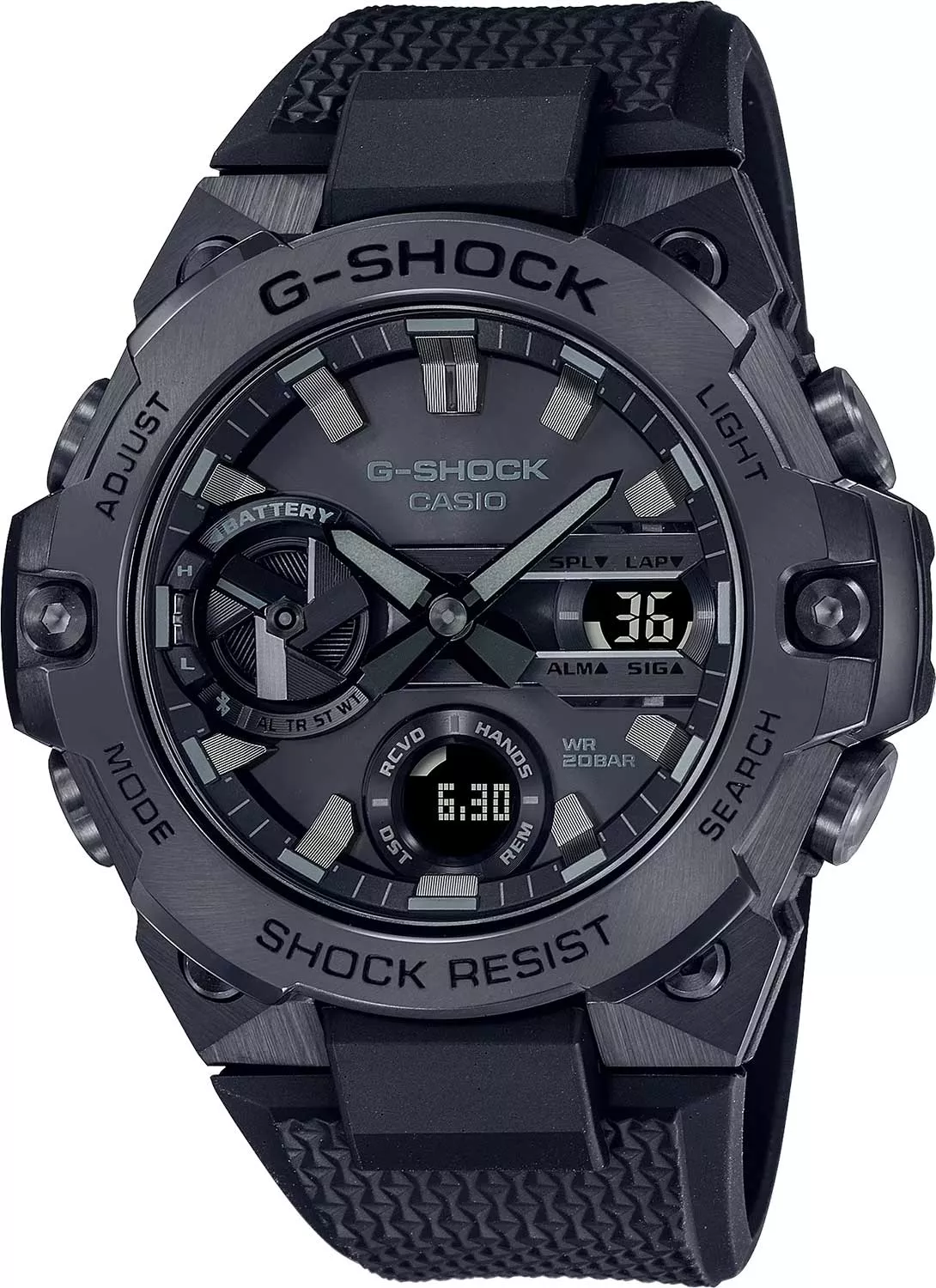 Эти часы от Casio порадуют вас своей функциональностью и надежностью. Часы для настоящих мужчин. G-Steel. Мужские часы. Питание от солнечной энергии Tough Solar - солнечные батарейки большой мощности, индикатор заряда батареи. Функция автоматического сохранения энергии. Время работы аккумулятора без подзарядки приблизительно 7 месяцев, при включенной функции сохранения энергии приблизительно 18 месяцев. Противоударный корпус защищает механизм от ударов и вибрации. Ударопрочная конструкция Carbon Core Guard объединяет корпус и заднюю крышку в единый карбоновый моноблок. Двойная подcветка: циферблат и ЖК-дисплеи подсвечиваются светодиодом, благодаря наличию функции задержки, после отпускания кнопки освещение горит еще несколько секунд. Настраиваемое послесвечение 1,5 или 3сек. Цвет подсветки: белый. Необритовое светонакопительное покрытие обеспечивает длительное послесвечение в темноте даже после кратковременного нахождения на свету. 12-ти и 24-х часовой формат времени. Секундомер с точностью показаний 1/100с (