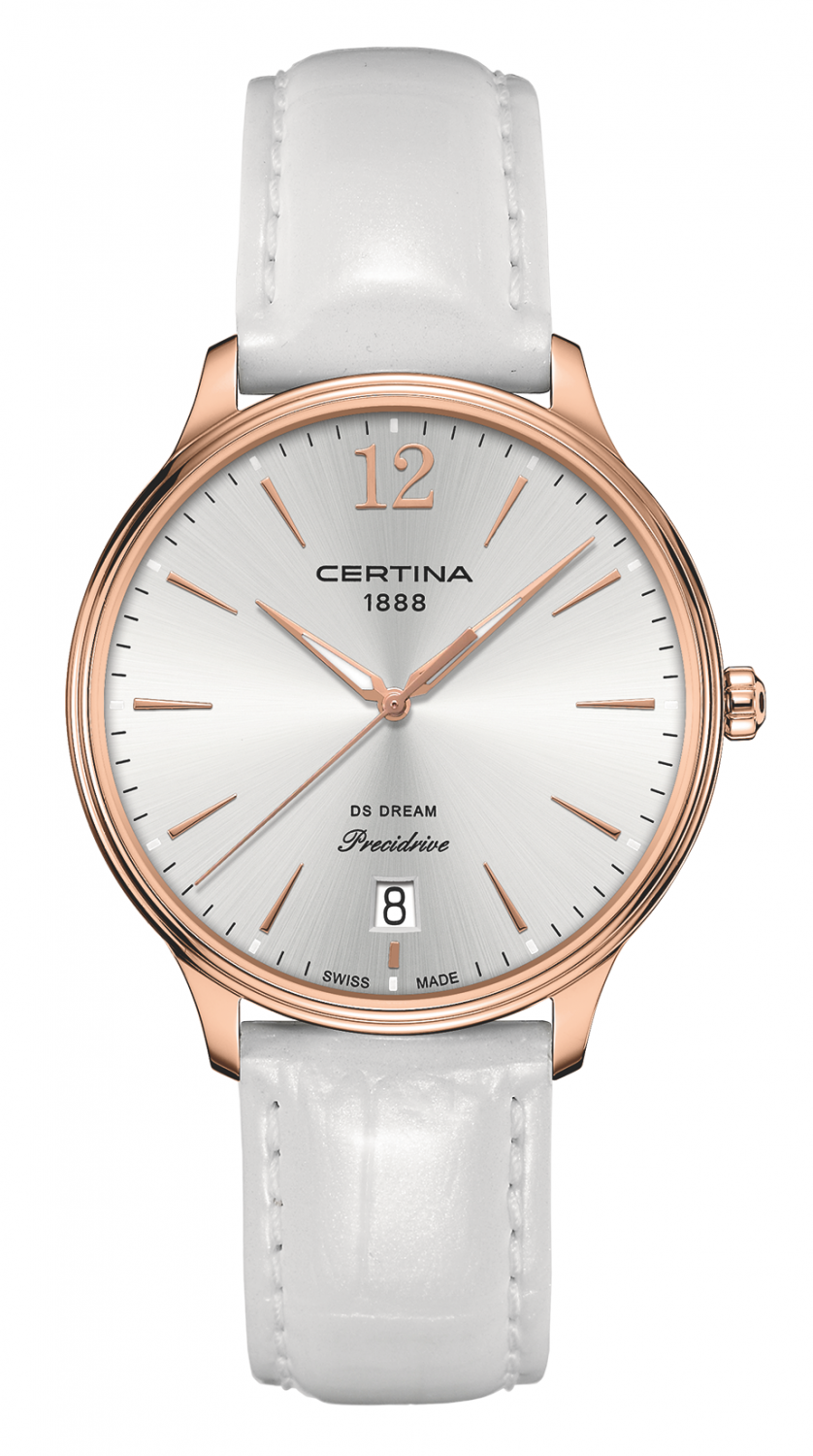 Классическая женская модель с индикацией часов, минут и секунд центральными стрелками, окошко даты в положении 6 часов