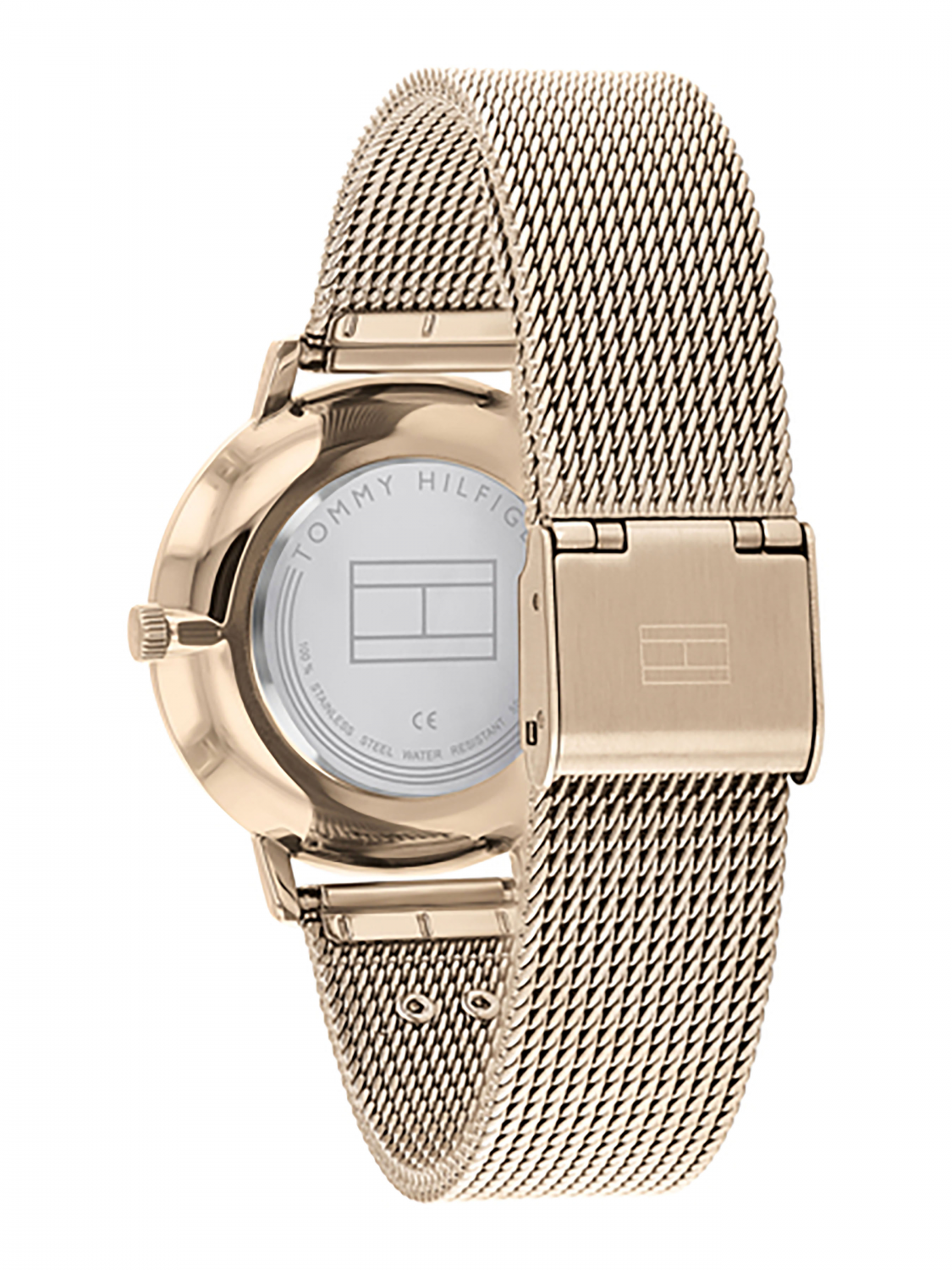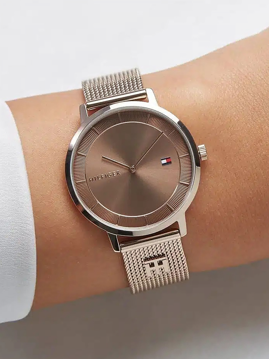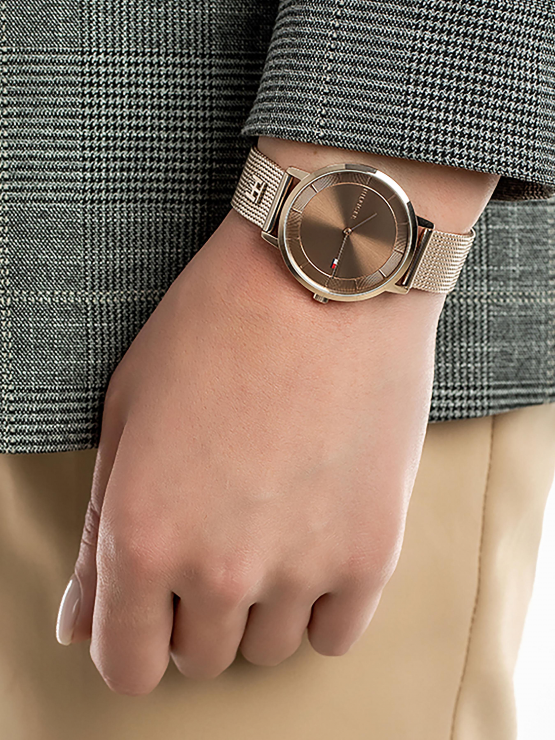 Женские кварцевые часы на стальном браслете миланского плетения. Часы с круглым корпусом. Минеральное стекло. Циферблат с метками в виде штрихов. Рифленая заводная головка.