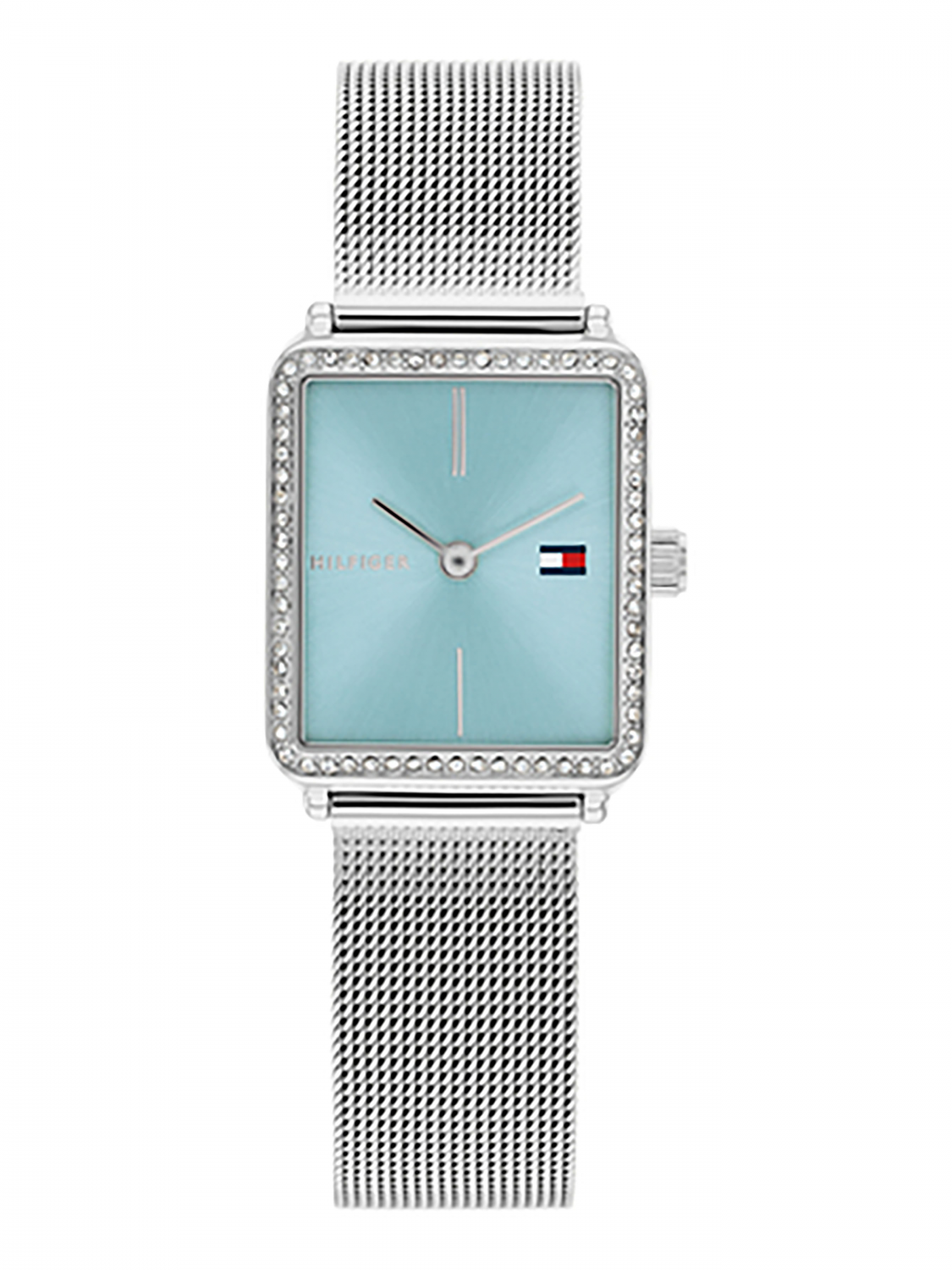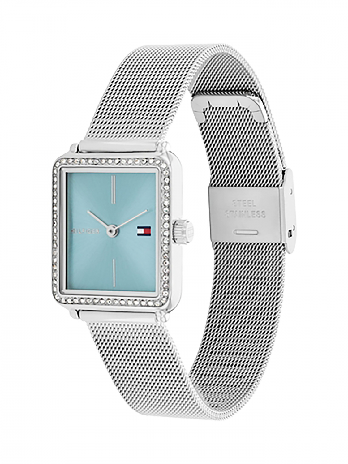 Женские кварцевые часы с прямоугольным корпусом 24мм из нержавеющей стали. Минеральное стекло. Стальной браслет миланского плетения. Рифленая заводная головка.