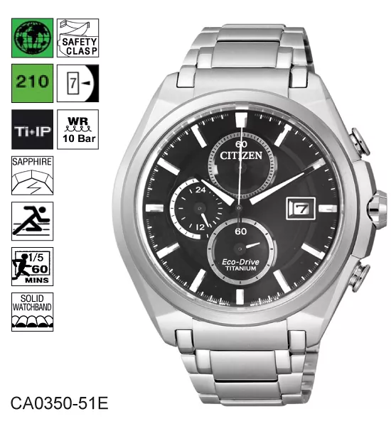 Модель: CA0350-51EФункции: Eco-Drive(никогда не требует замены батареи); Запас хода 210 дней; Хронограф; Секундомер: 1/5 сек., макс. 60 мин.; Указатель даты; Super Titanium Ti+IPТитан с ионным покрытием; Сапфировое стекло; Литой металлический браслет; Безопасная застёжка браслета; Водозащита 10 БАР;Толщина корпуса: 12mm; Ширина корпуса: 45mm;; Вес: 95г