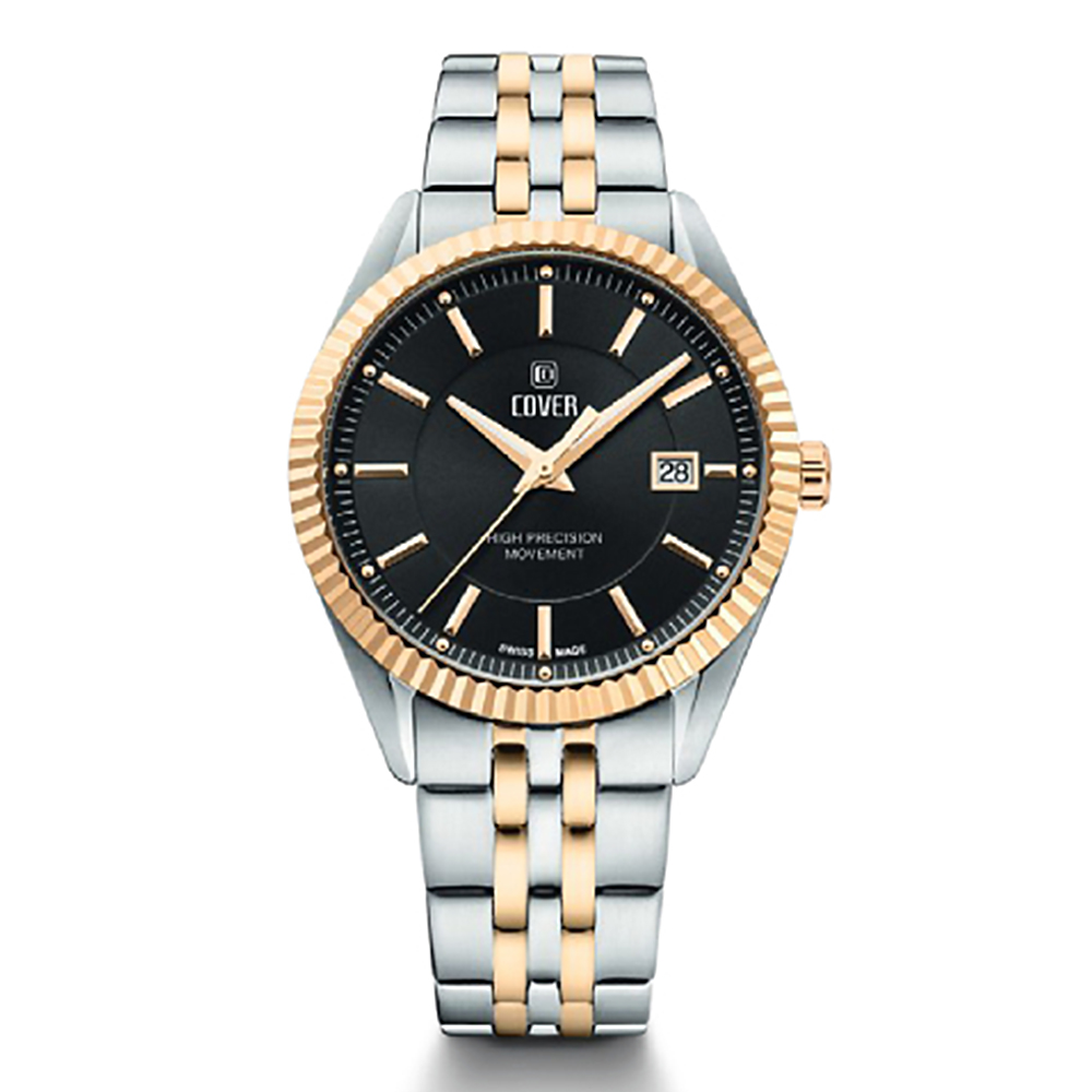Циферблат черного цвета с текстурированным узором и контрастными штрихами, защищен минеральным стеклом с сапфировым напылением. Браслет из нержавеющей стали с частичным PVD-покрытием цвета желтого золота. Безель рифленый с PVD-покрытием.