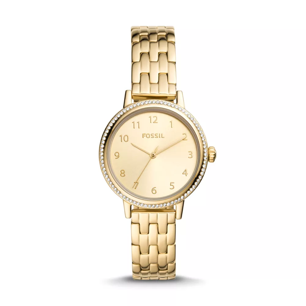 Удобные часики на стальном браслете от компании Fossil - выбор современных модниц. Reid. Женские часики с круглым корпусом. Метки в виде арабских цифр. Циферблат выполнен по технологии Sunray (солнечные лучи). Безель украшен паве из кристаллов. Рифленая заводная головка. Браслет с раскладывающейся застежкой.