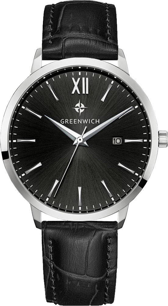 На циферблате только необходимые детали, поэтому время считывается без затруднения. Полировка «sun ray» в виде лучей, исходящих от центра визуально выделяет три стрелки: часовую, минутную и секундную. Для определения даты есть окошко в правой части напротив маркера «3 часа». Часы комплектуются ремешком из натуральной кожи или стальным браслетом. Классические часы Greenwich — важная деталь вашего образа.