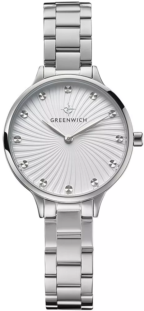 Рельефные лучи, расходящиеся из центра белого циферблата, создают впечатление вихря. А серебристые накладные индексы, имеющие множество граней, хорошо отражают свет — это позволяет точно определить время.