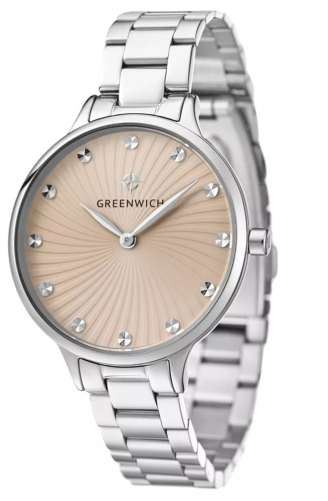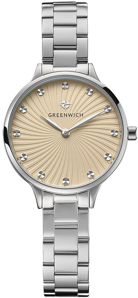 Рельефные лучи, расходящиеся из центра бежевого циферблата, создают впечатление вихря. А серебристые накладные индексы, имеющие множество граней, хорошо отражают свет — это позволяет точно определить время.