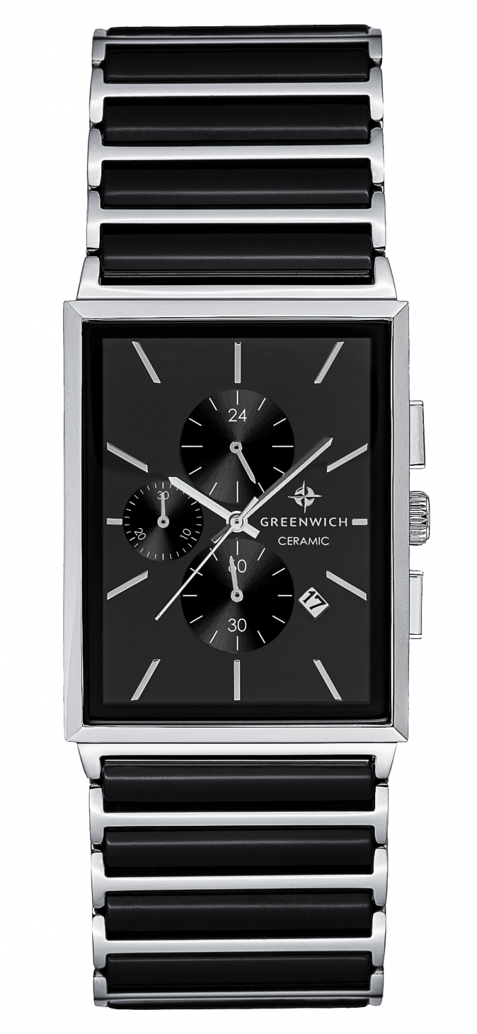 Кварцевые часы в корпусе прямоугольной формы — эффектный и статусный аксессуар на браслете из высокотехнологичной керамики черного цвета. Четкие линии и продуманное расположение позволяют легко считывать информацию центральных стрелок и трех дополнительных индикаторов хронографа на черном циферблате.