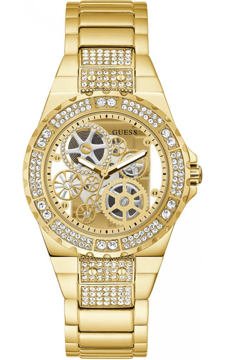 Корпус и браслет выполнены из нержавеющей стали с золотым покрытием. Безель украшен кристаллами сваровски. Циферблат защищает минеральное стекло , устойчивое к микроцарапинам. Водозащита 3АТМ..