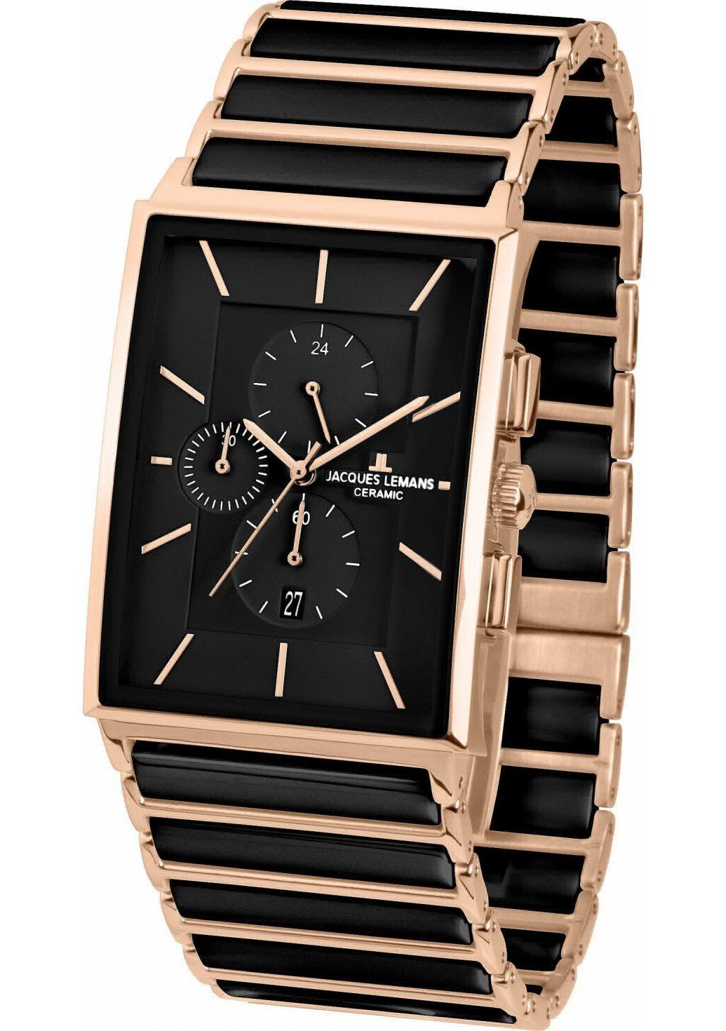 Необычный мужской хронограф серии York создан в эргономичном корпусе прямоугольной формы. На двухуровневом циферблате разместились 24-часовой индикатор, 30-минутный накопитель и вынесенная секундная стрелка, в индикатор которой гармонично вписана апертура даты. Функциональные кнопки хронографа так же выполнены в форме прямоугольника. Центральные звенья браслета выполнены из высокотехнологичной керамики черного цвета. Этот стойкий к появлению микроцарапин материал позволяет на долгое время сохранить превосходный внешний вид часов, а использование стальных звеньев по бокам браслета увеличивает его прочность. В часах установлено минеральное стекло с сапфировым напылением. Стальные детали оформлены с помощью PVD-покрытия из розового золота.
