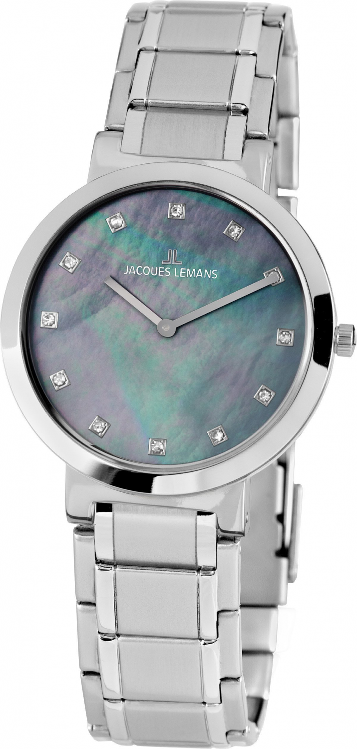 В дизайне этих кварцевых женских часов прежде всего привлекает отсутствие лишних деталей. Прямые линии часовой и минутной стрелок на циферблате, выполненном из натурального перламутра, дополняют надежно закрепленные кристаллы Swarovski. Особая красота браслета прослеживается в сочетании полированных и матовых частей. Данную модель можно приобрести в стальном варианте.