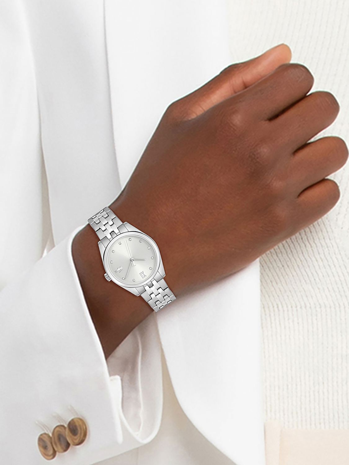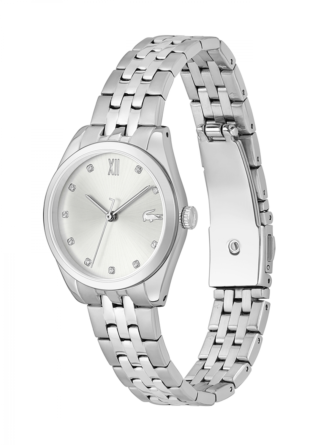 Кварцевые женские часы. Круглый стальной корпус с минеральным стеклом. Циферблат украшен фирменным логотипом и кристаллами. Секундная стрелка в виде фирменной буквы логотипа ''L''. Удобный и надежный стальной браслет с раскладывающейся застежкой.