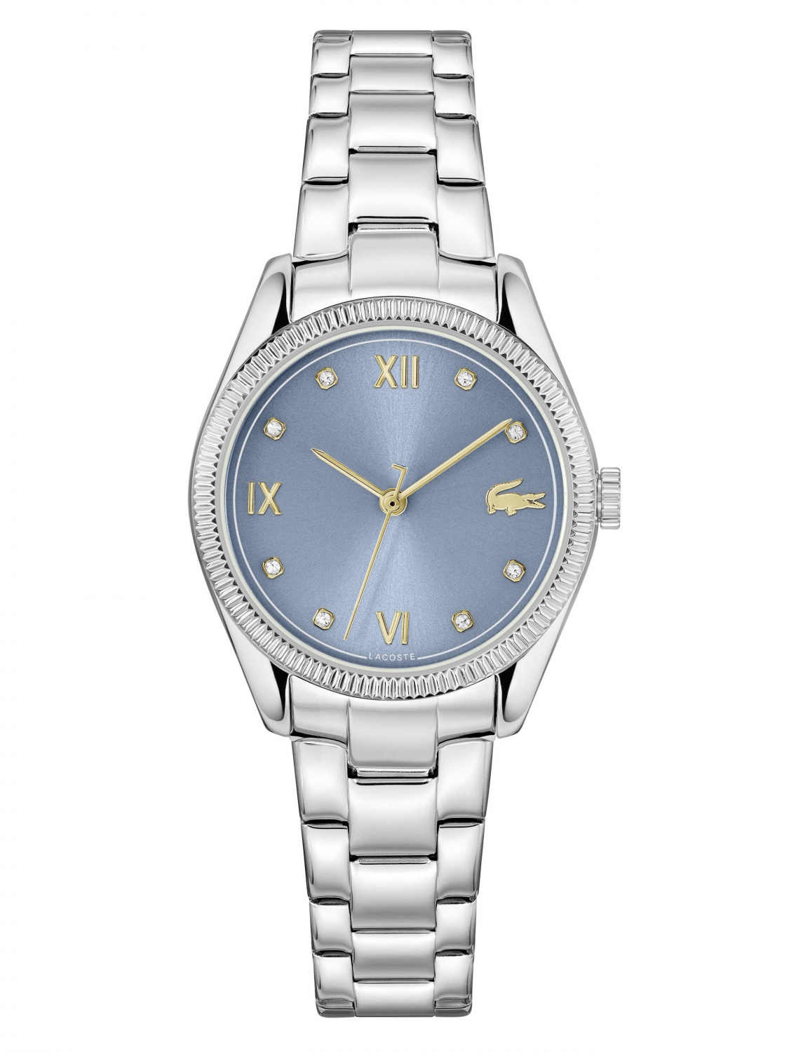 Голубой циферблат с кристаллами защищен минеральным стеклом, устойчивым к мелким повреждениям и царапинам.