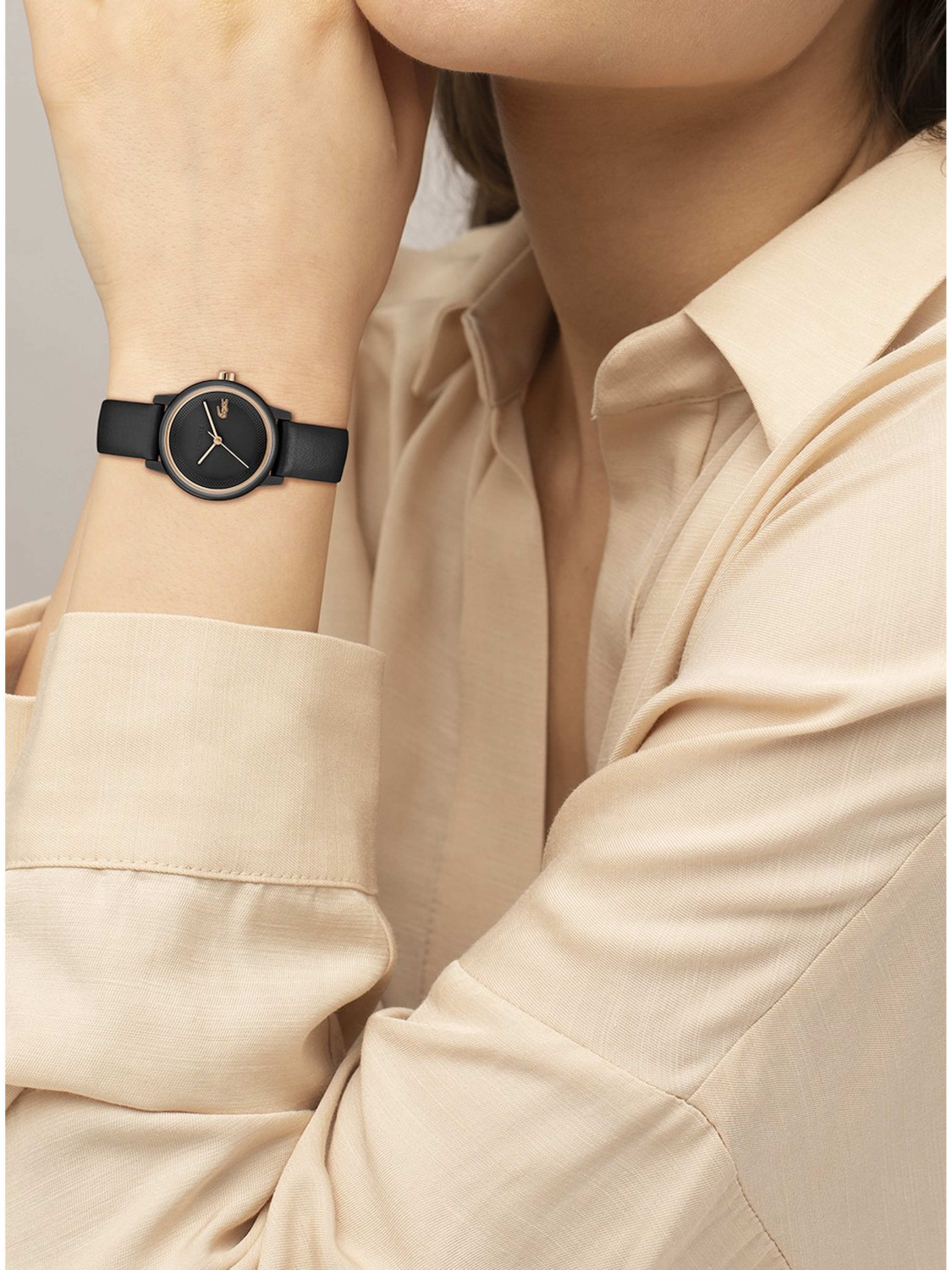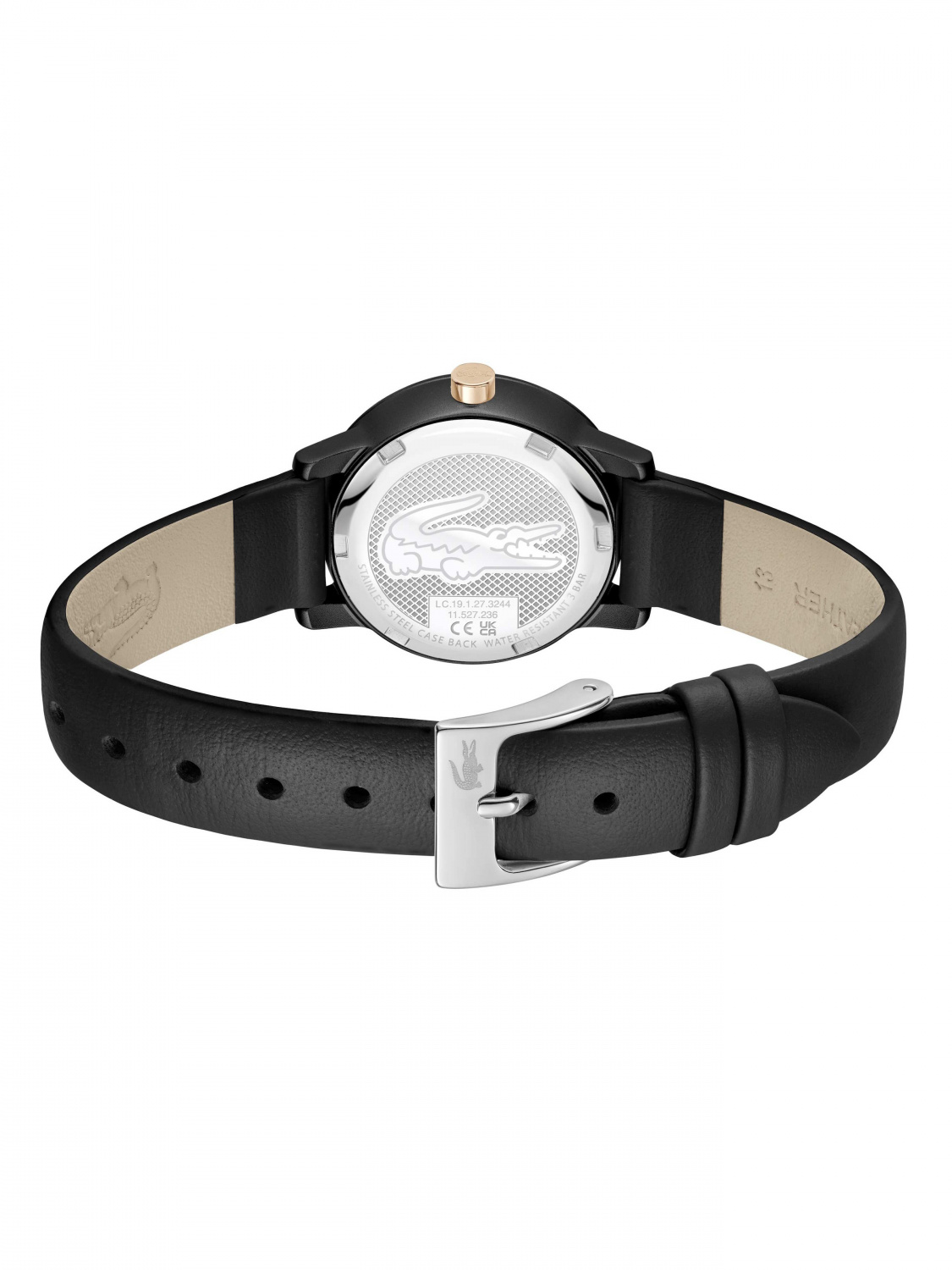 Черный циферблат с логотипом бренда защищен минеральным стеклом.
