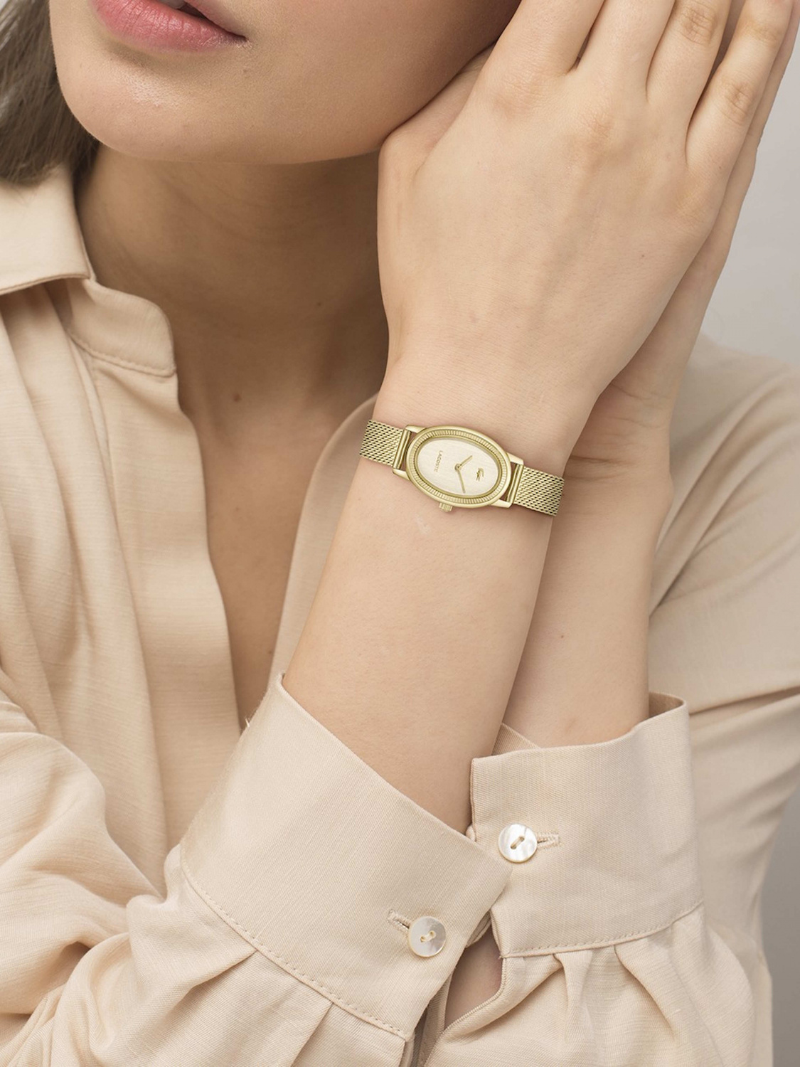 Овальный корпус и браслет миланского плетения выполнены из нержавеющей стали 316L с PVD покрытием.