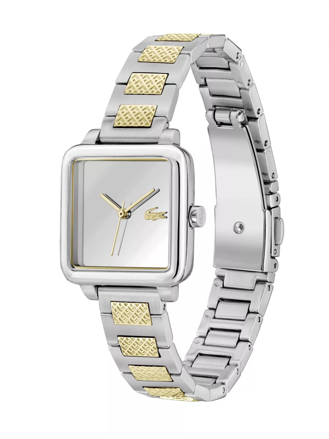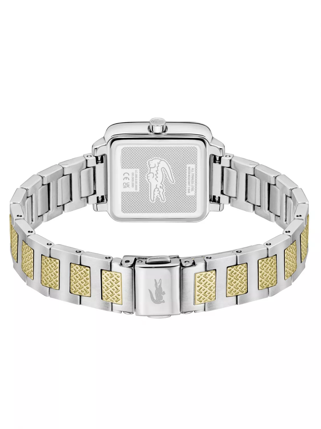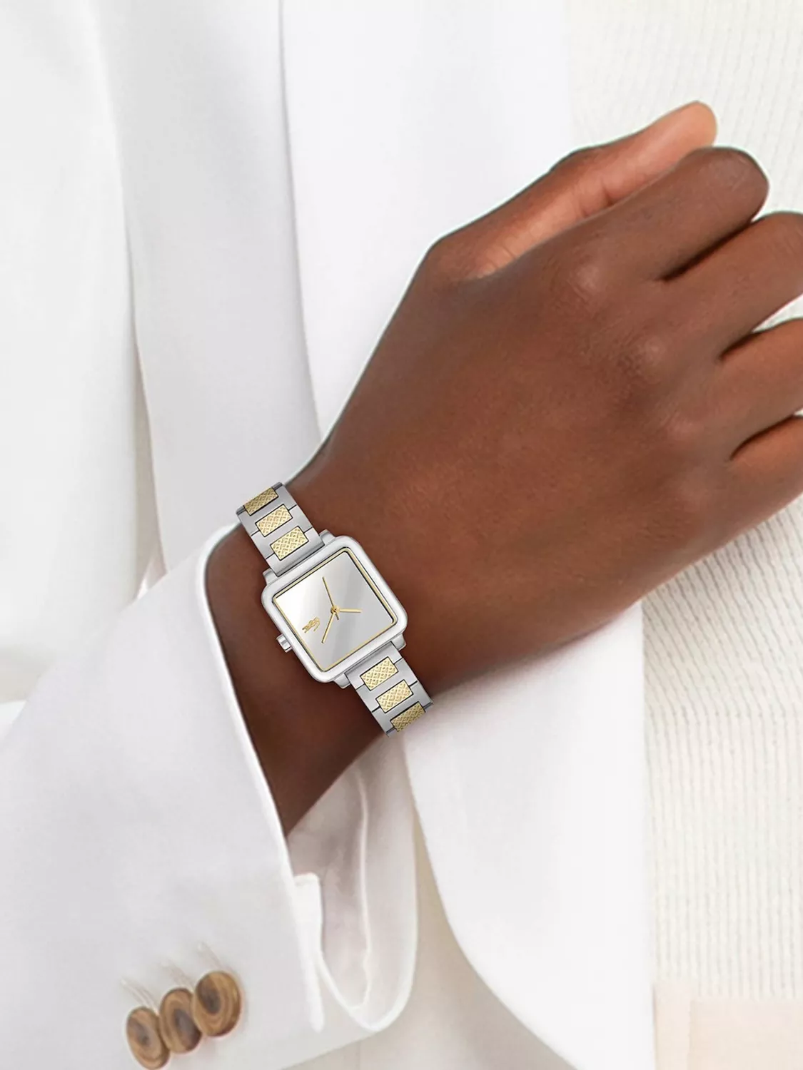 Квадратный корпус часов выполнен из нержавеющей стали.