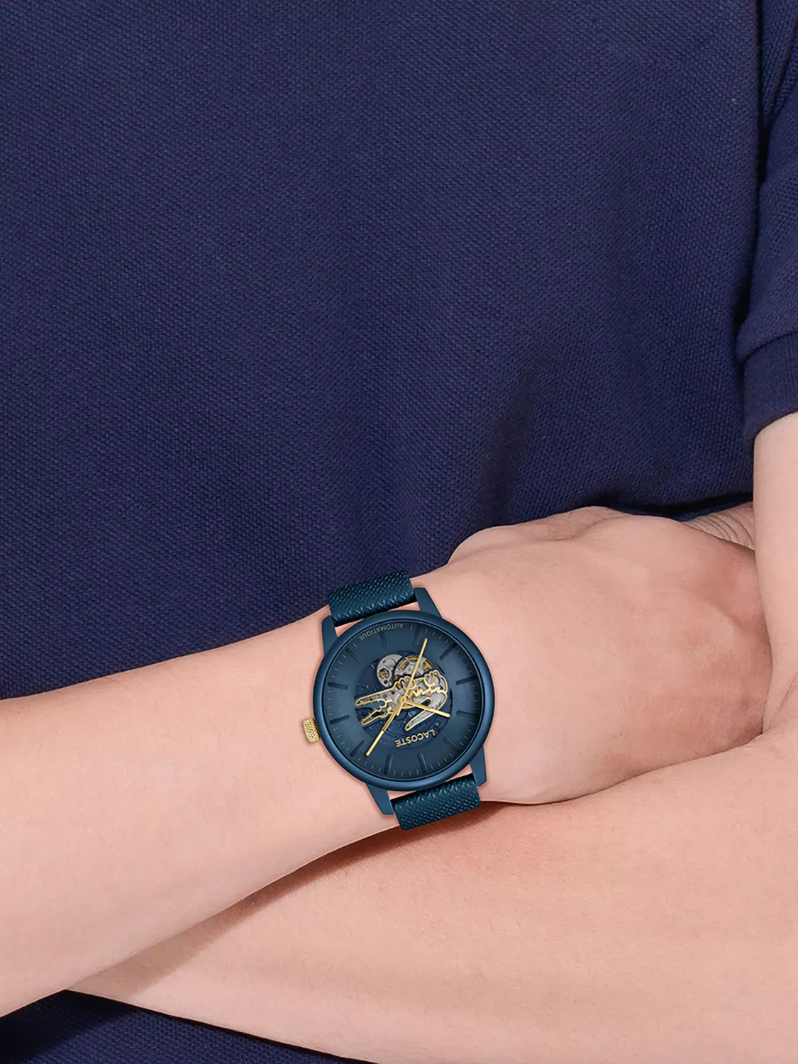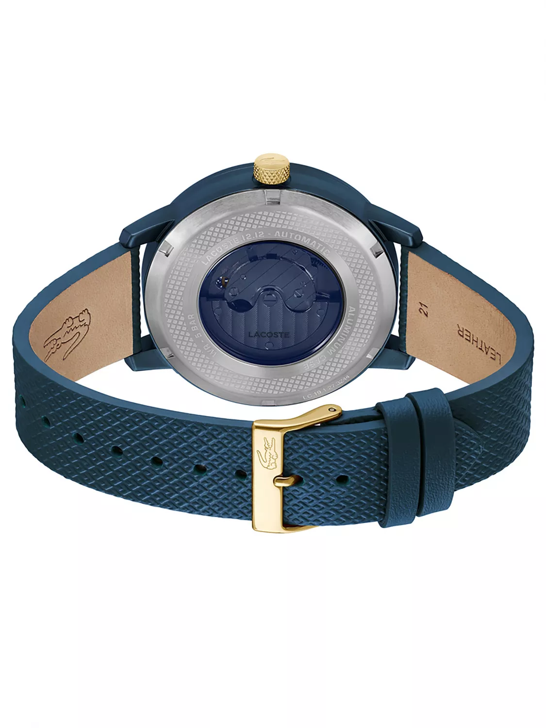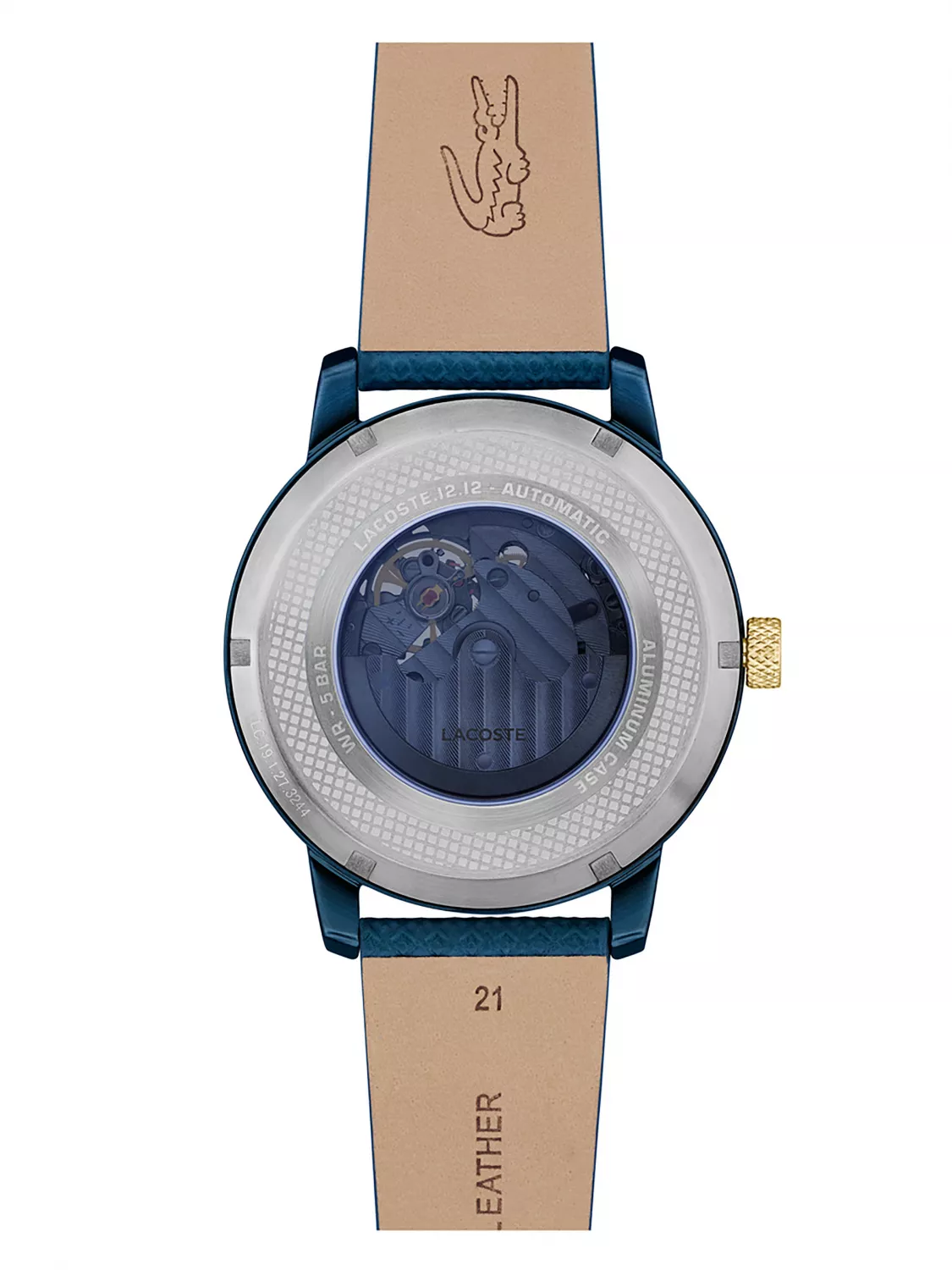 Круглый алюминевый корпус с IP покрытием. Минеральное стекло устойчивое к появлению царапин. Синий циферблат типа «open heart» с отверстием в форме крокодила, через которое видна работа механизма.