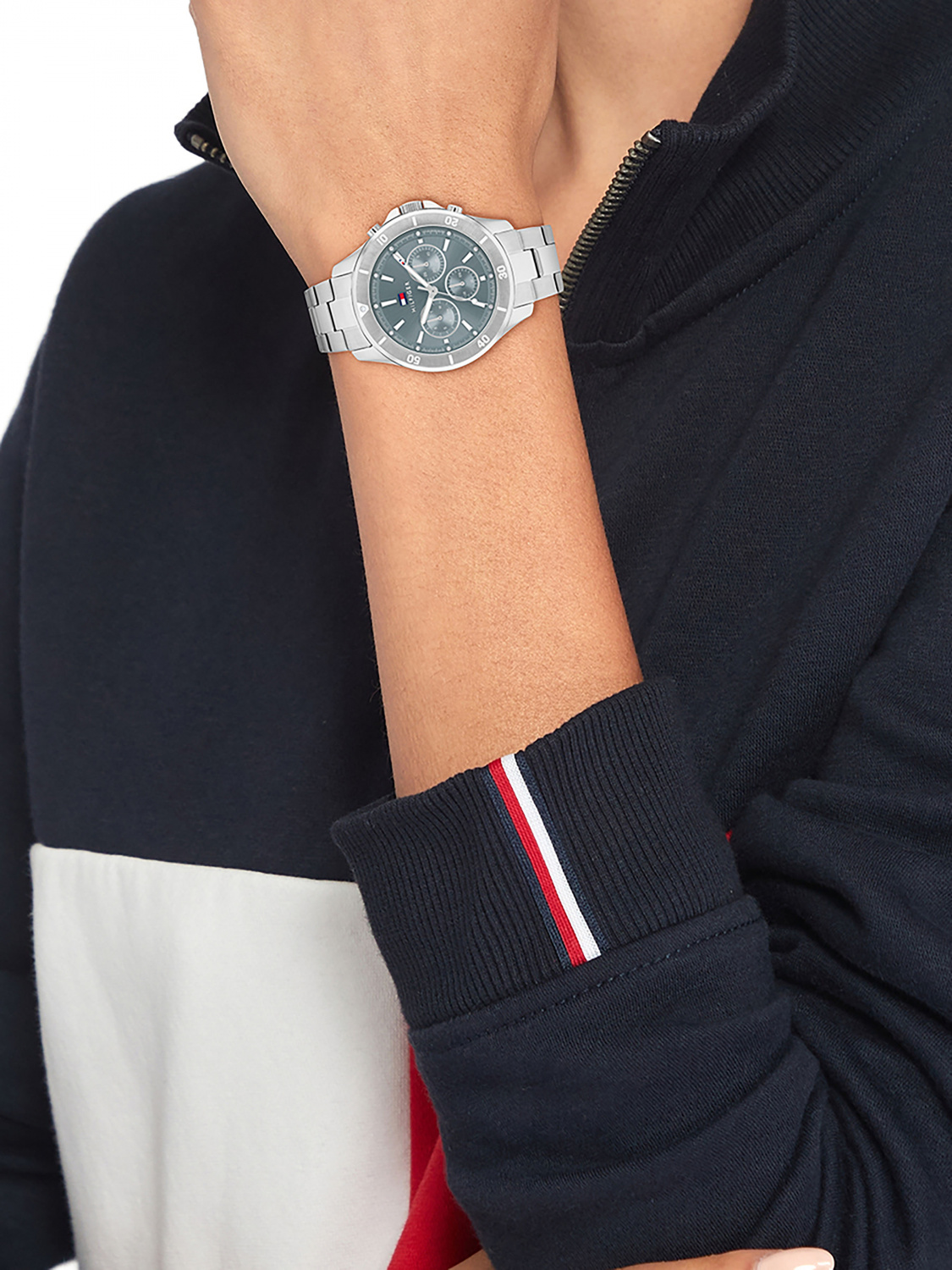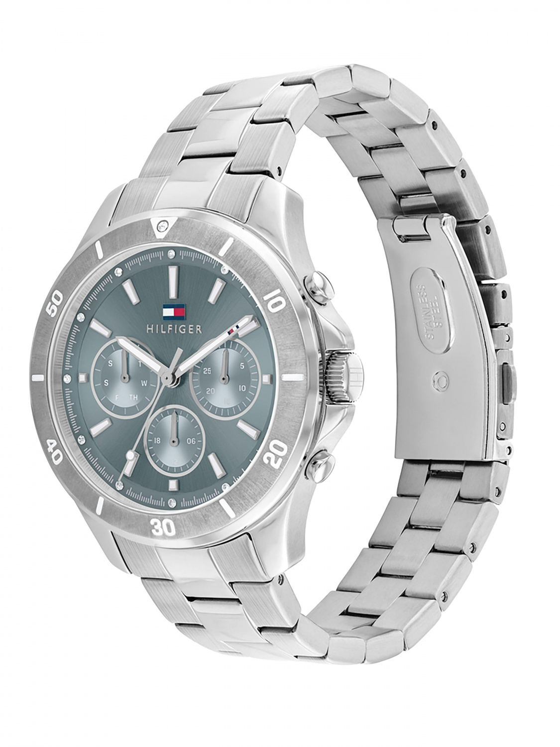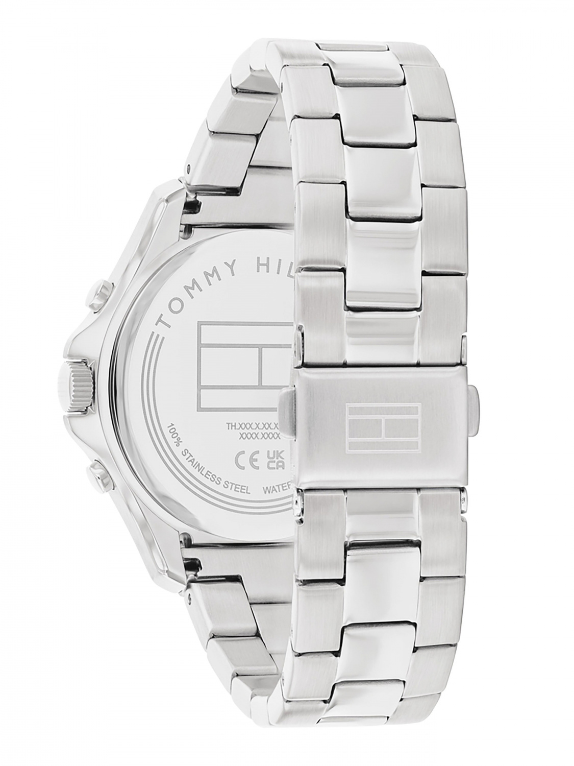 Женские кварцевые часы Tommy Hilfiger. Коллекция Aspen. Метки в виде штрихов.12-ти и 24-х часовой формат времени. Дата и день недели вынесены на отдельные циферблаты. Минеральное стекло. Корпус и браслет выполнены из стали. Браслет с раскладной застежкой. Водозащита 5 АТМ/bar.