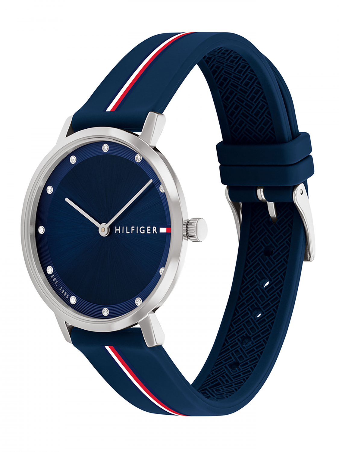 Часы наручные женские кварцевые Tommy Hilfiger. Стальной корпус с синим циферблатом. Минеральное стекло. Спортивный,силиконовый ремешок,выполнен в цветовом решении этого бренда.Ремешок на традиционной застежке.Водозащита 5ATM.