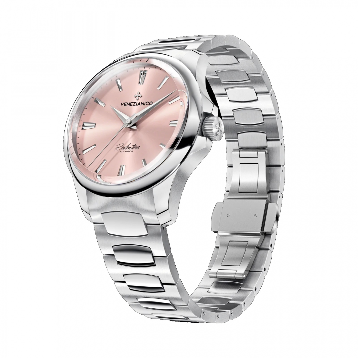 Привлекательные женские часы станут отличным дополнением любого вашего образа. Redentore 36. Часы с круглым корпусом. Дизайн вдохновлен храмом Basilica del Redentore, который находится на самом широком острове Венеции. Архитектор храма Андреа Палладио, который известен как отец неоклассического стиля. В механизме 24 камня, 21600 полуколебаний в час. Запас хода 41 час. Возможность ручного завода. Циферблат с метками в виде штрихов выполнен по технологии Sunray (солнечные лучи). Задняя крышка крепится на 6-ти винтах и украшена выгравированным изображением храма Basilica del Redentore. Рифленая заводная головка с защитой. Браслет Canova с раскладывающейся застежкой. Для изготовления данного браслета требуется 16 различных форм.